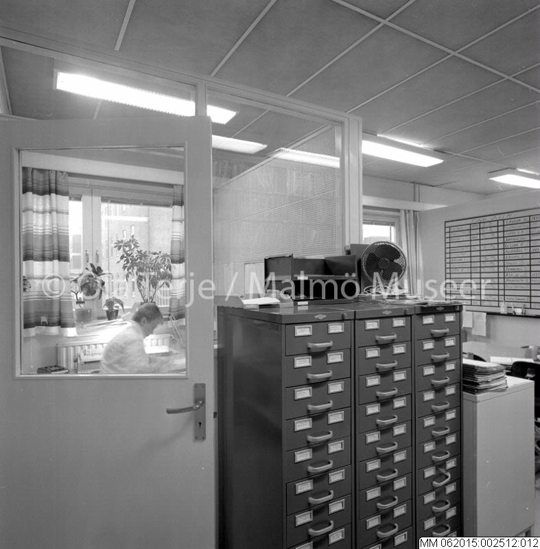 Onkologiska kliniken vid Lunds Lasarett, sekreterarrum med byrå för registerkort. 880209.