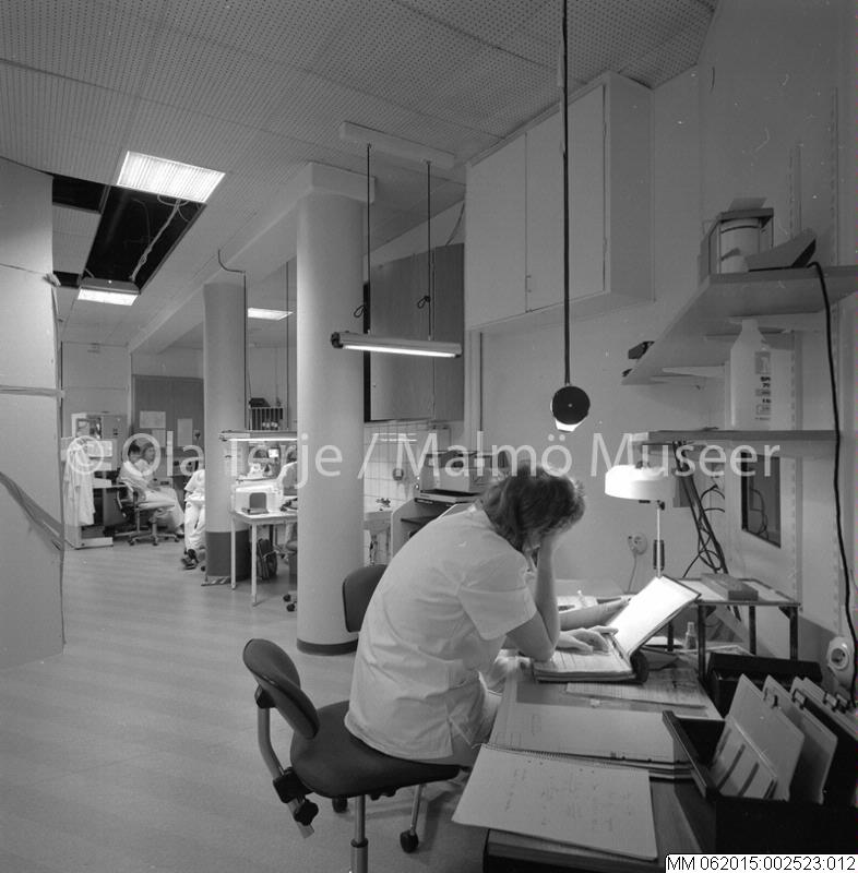 Onkologiska kliniken vid Lunds Lasarett, personal i korridor på strålningsavdelningen ESA. 880209.