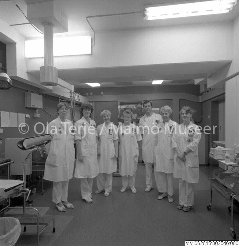Onkologiska kliniken vid Lunds Lasarett, gruppbild av personalen på gynekologimottagningen. 880216.