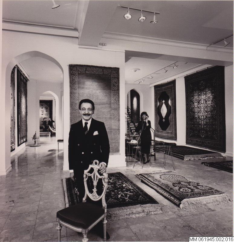 arhan, arhans mattaffär, mattaffär, affär, matta, mattor, porträtt, man, män, kvinna, kvinnor, interiör, arhans, orientaliska mattor, orientalisk, stol, handelsman, telefon