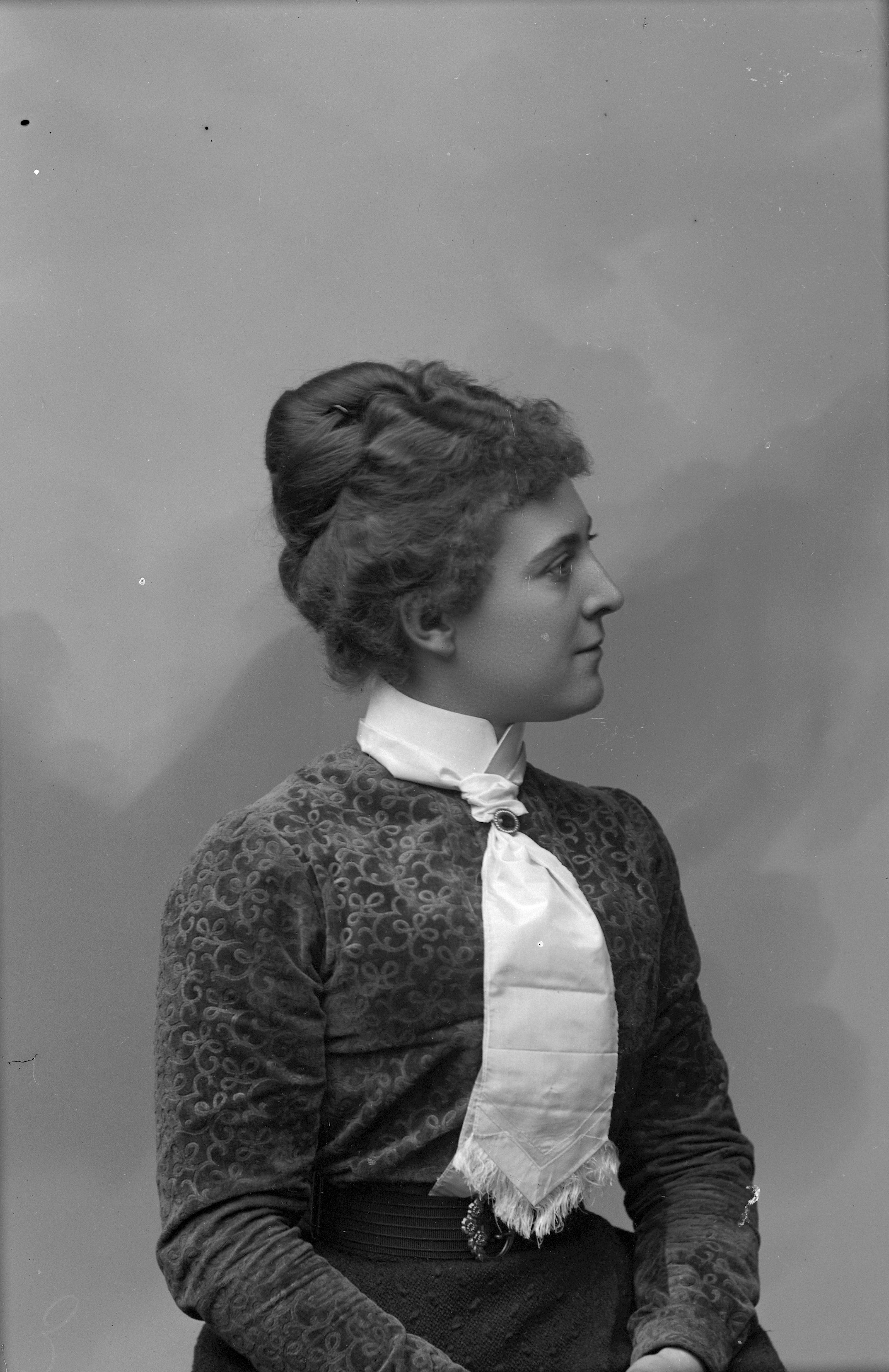 Porträtt i halvfigur av fröken Helmer, ansikte i profil.