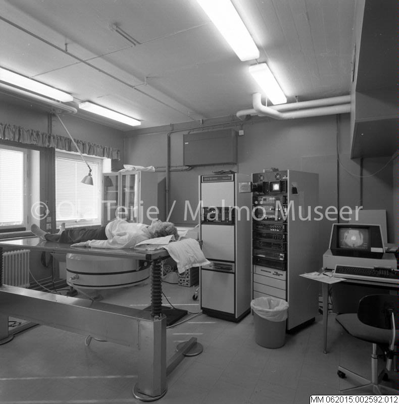 - Onkologiska Kliniken vid Lunds Lasarett. Dokumentation av lokaler och verksamheter. 1988. Isotopavdelning : isotoplaboratorium med patient.