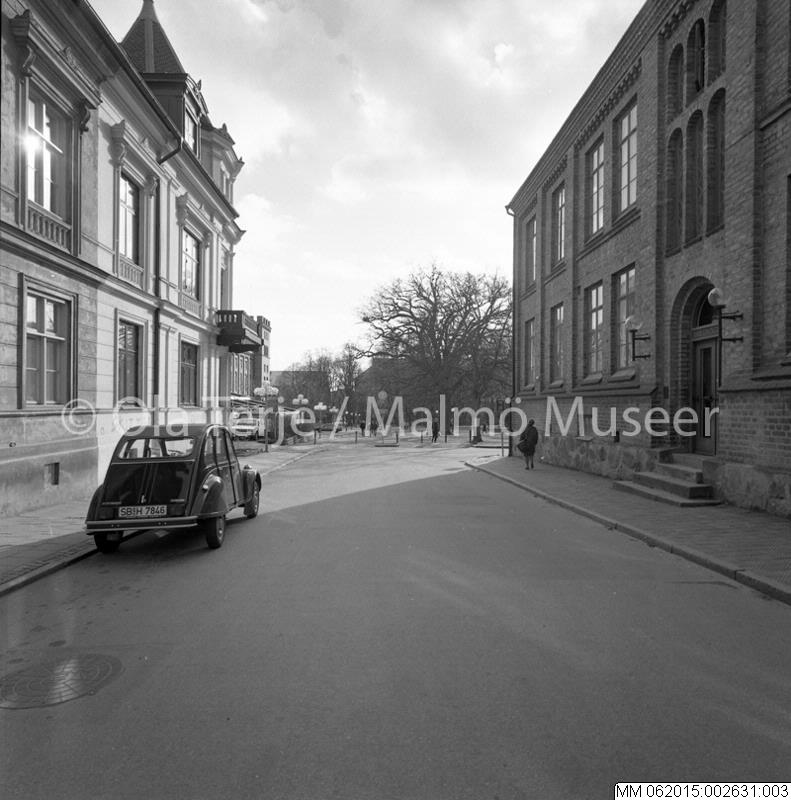 Projekt Lundagård. 1989. Sandgatan i Lund med AF-borgen i bakgrunden.