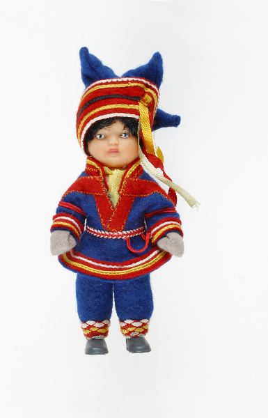 Docka, pojke, i samedräkt. Blåa byxor och jacka med gula, röda och vita dekorationsband. Grå vantar, blå 4-flikig mössa med brett band i rött, svart och gult. Från Nord Norge enligt etikett på dockan.