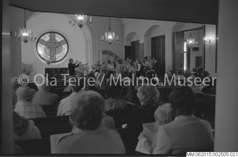 Pingst i Kirsebergskyrkan. 25 maj 1980. Kyrkans medlemmar sjunger tillsammans med kyrkokören.