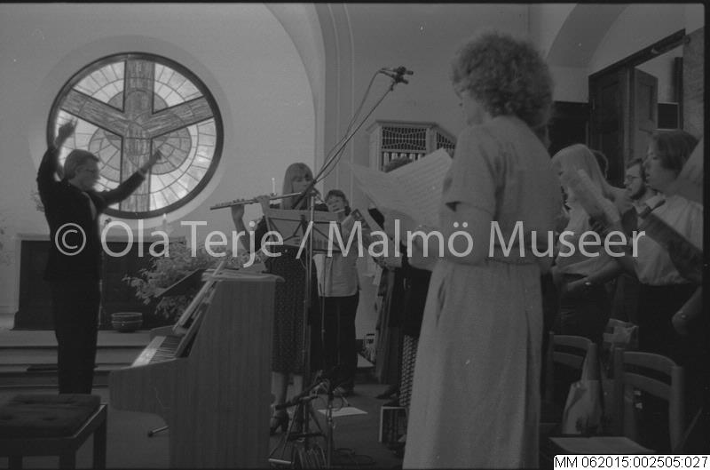 Pingst i Kirsebergskyrkan. 25 maj 1980. Kyrkans medlemmar sjunger tillsammans med kyrkokören.