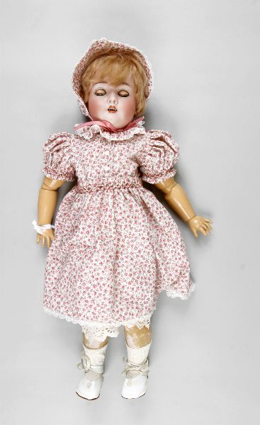 - Docka, flicka, med huvud av porslin och kropp av målat trä. Ledade armar och ben, blundögon av glas, hår av syntetfiber. Stämpel rygg "Made In Germany", stämpel nacke "4 61". Nysydda kläder av rosablommigt bomullstyg och syntetspets; klänning med puffärm och smock, mamelucker av vitt bomullstyg med brodyrkant, bahytt med knytband. Strumpor av vit bomullstrikå, skor av tunt vitt läder. Dessa är äldre än övriga plagg.
