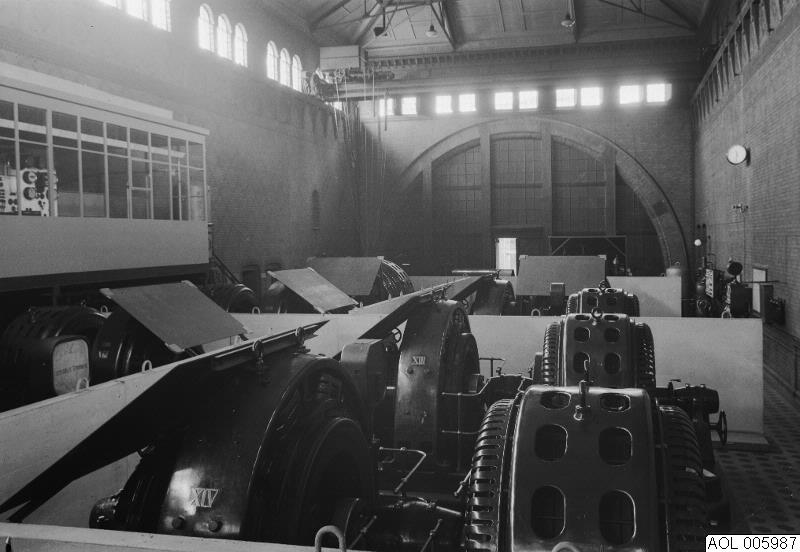 Malmö Elverk, Turbinhallen. Elektricitetsverket anlades 1899-1901. Ström började levereras 1 okt 1901. Senare Rooseum och Moderna Museet, Malmö.