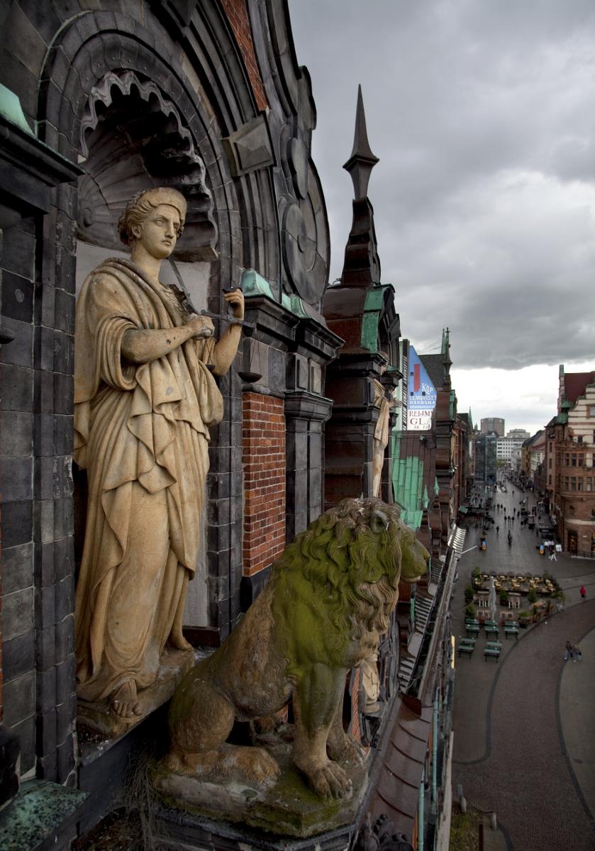 Södergatan. Figurerna på råd husets fasad representerar rättvisan och några av de näringsfång som givit Malmö dess välstånd. De vaktar nu inloppet till shoppingfarleden Södergatan. S:t Petri-kyrkans spira är ett fyrtorn för den som lockas av den mer smala vägen (ur Dokument Malmö).