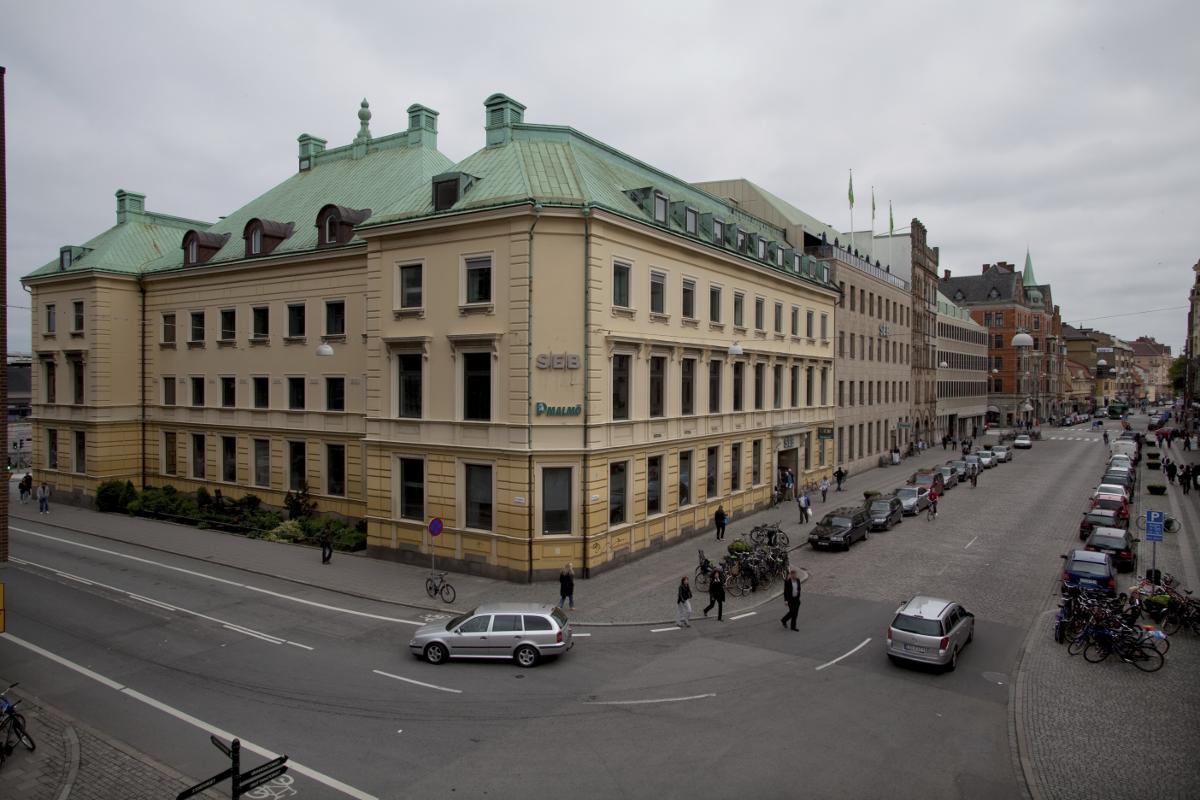 Östergatan är SEB:s säte i Malmö. Här höll Malmö FF sina årsfester när bankdirektören Hans Cavalli-Björkman var ordförande. Även Parkering Malmö har sitt huvudkontor i huset. (Ur Dokument Malmö).