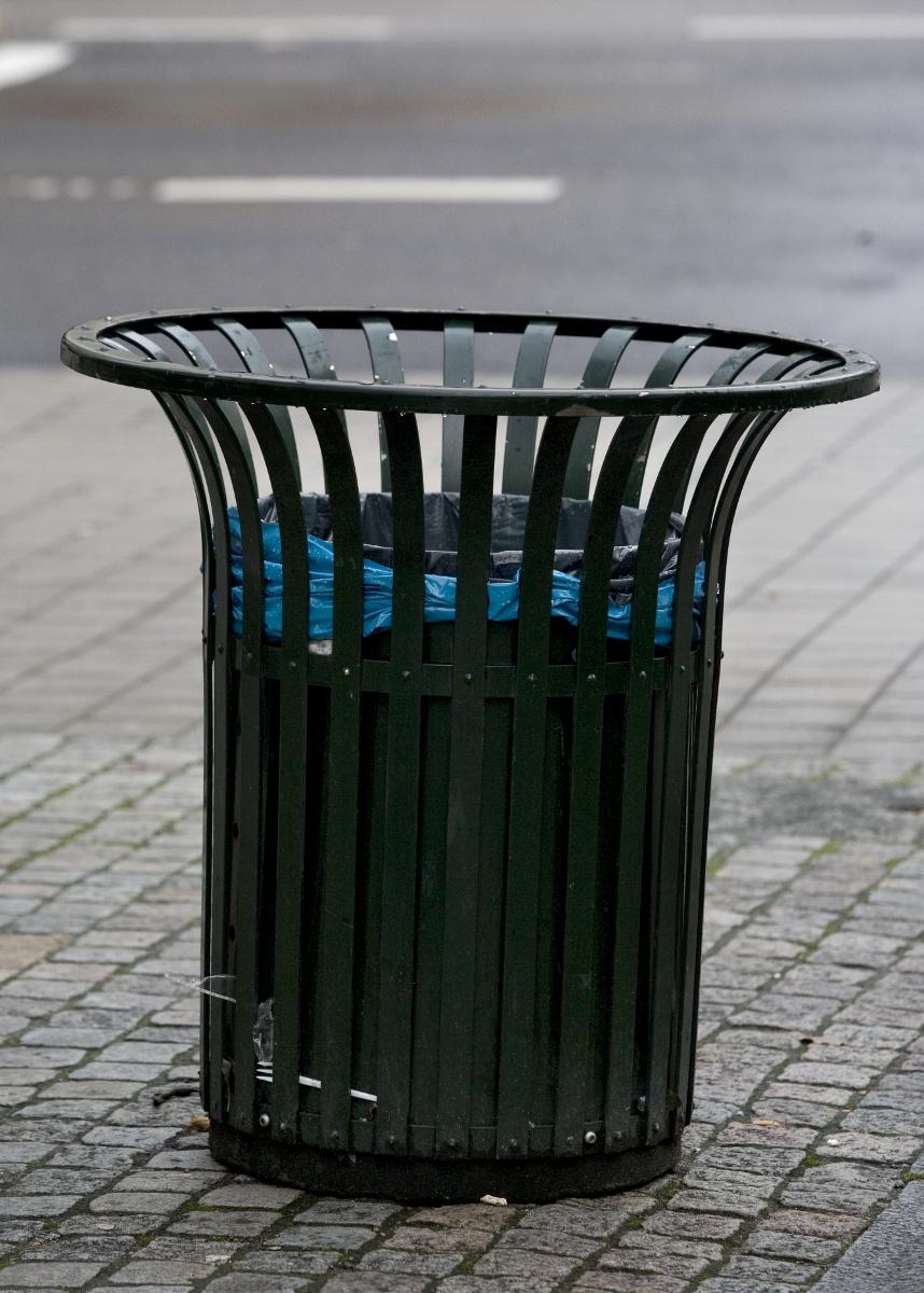 Papperskorgar är inte någon skräpfråga. Grönt är Malmös signalfärg. Därför är också de flesta papperskorgar här ”Malmögröna”. Men 2008 gjorde gatukontoret ett mer färgstarkt försök och det tycktes som om röda papperskorgar gör sitt jobb effektivare. (Ur Dokument Malmö).