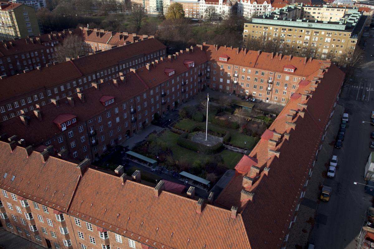 Centrum, Malmö, innergårdar, bostadshus, bostadsområde, vy, kvarter, bilar, flaggstång