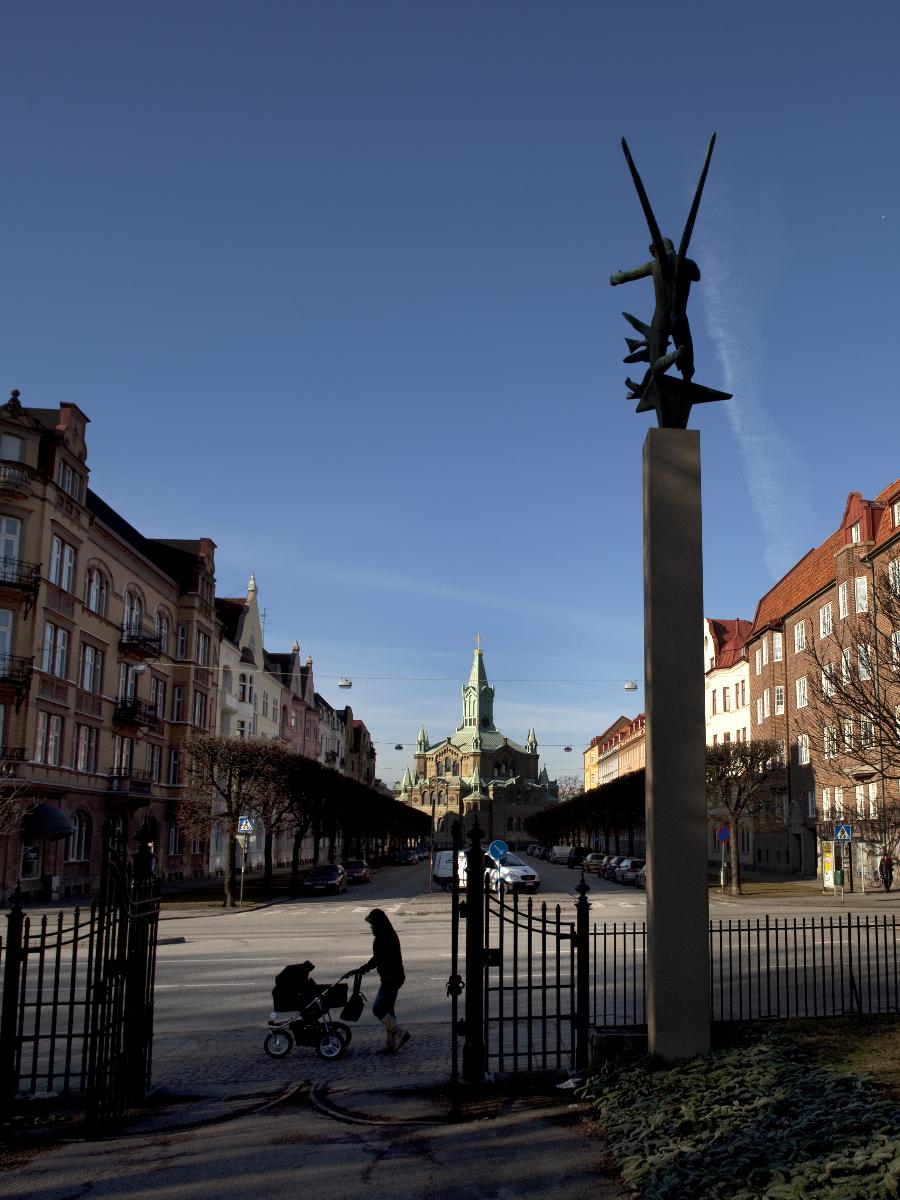 S:t Pauli kyrka. Sedd från ingången till kyrkogården framstår sexkantiga S:t Pauli kyrka som Rörsjöstadens obestridliga mittpunkt. På Paulikyrkogårdarna ligger bland andra konstsamlaren Fredrik Roos, MFF-hövdingen Eric Persson och poeten Hjalmar Gullberg begravda. (Ur Dokument Malmö).