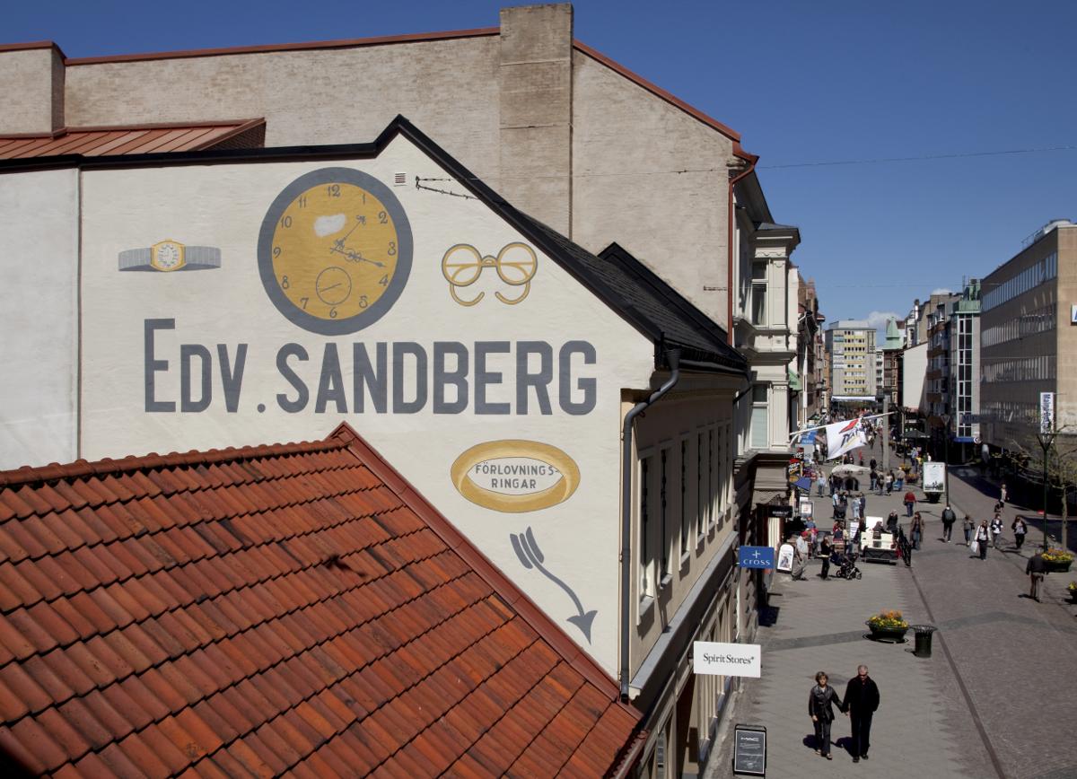 Södra Förstadsgatan. Den norra delen blev gågata i skiftet mellan 80- och 90-tal, i samband med det häftigt omstridda Triangelnprojektet. Sedan dess har gatan successivt och systematiskt anpassats till samtida shoppingkultur. Skriften på väggen vittnar om att Södra Förstadsgatan har en lång historia som butiksstråk. Gatan blev en del av den egentliga staden mot slutet av 1800-talet. Hos Edv. Sandberg kunde man uppenbarligen hitta såväl klockor och pincetter som glasögon och förlovningsringar. Södra Förstadsgatan är också en latteled, en av Malmös cafétätaste gator. Tunga kedjor som Espresso House och Wayne’s Coffee samsas med uppstickare som Barista och ett klassiskt kondis som Hollandia. (Ur Dokument Malmö).