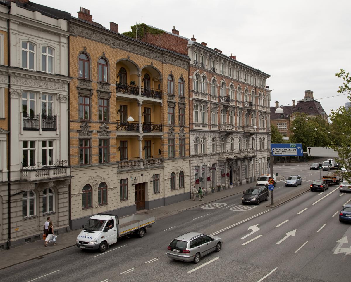 Regementsgatan. Den del av gatan som skär genom Centrum är en hårt trafikbelastad pulsåder. Hörnhuset Regementsgatan 20/Fersens väg 2 var på 90-talet lämpligt nog officiell hemadress för Göran Persson, rikshushållare känd för sitt hårda budgetregemente. (Ur Dokument Malmö).