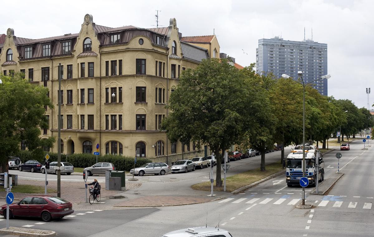 Malmö, V Innerstaden, gata, bilar, cyklist, övergångsställe, hus, träd, Kronprinsen