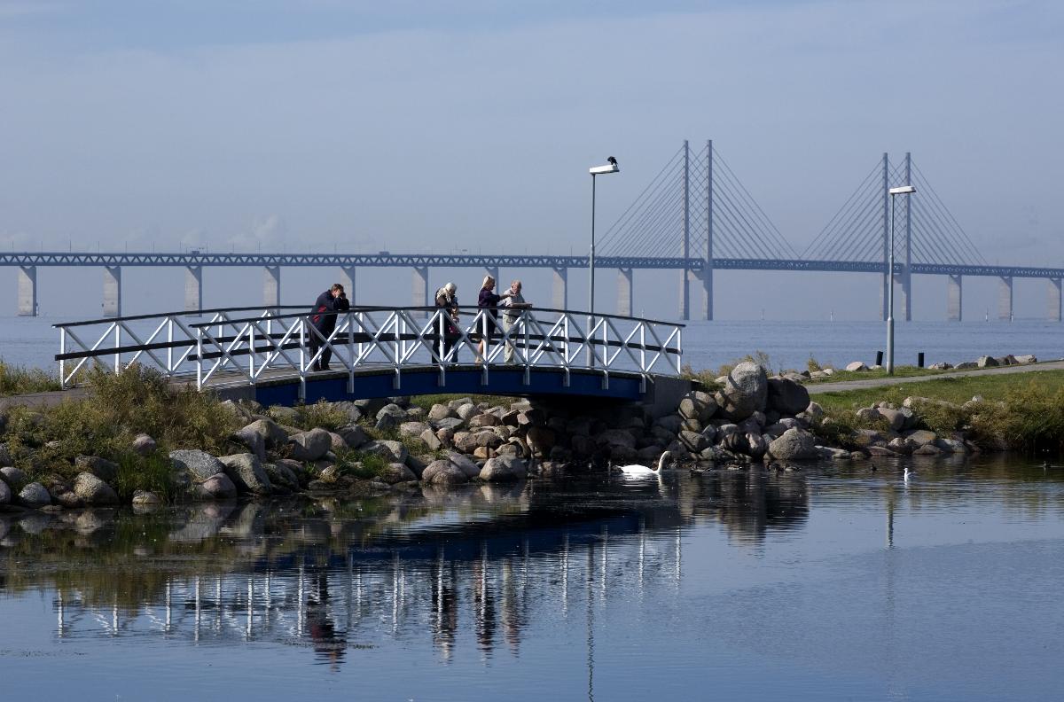 Limhamn, bro, broar, Öresundsbron, vatten, hav, Öresund, svan, människor, gångbro