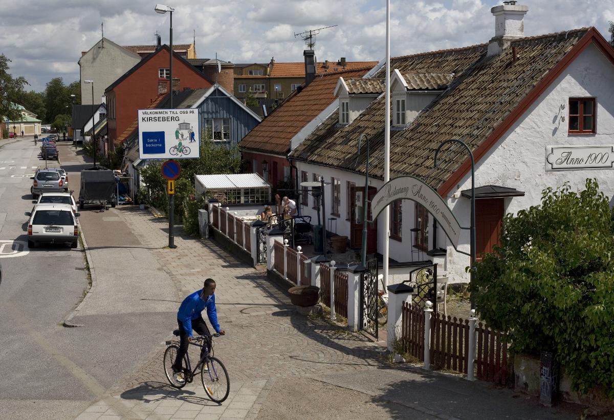 Kirseberg, restaurang, krog, Anno 1900, hus, gata, bilar, cyklist, staket, skylt