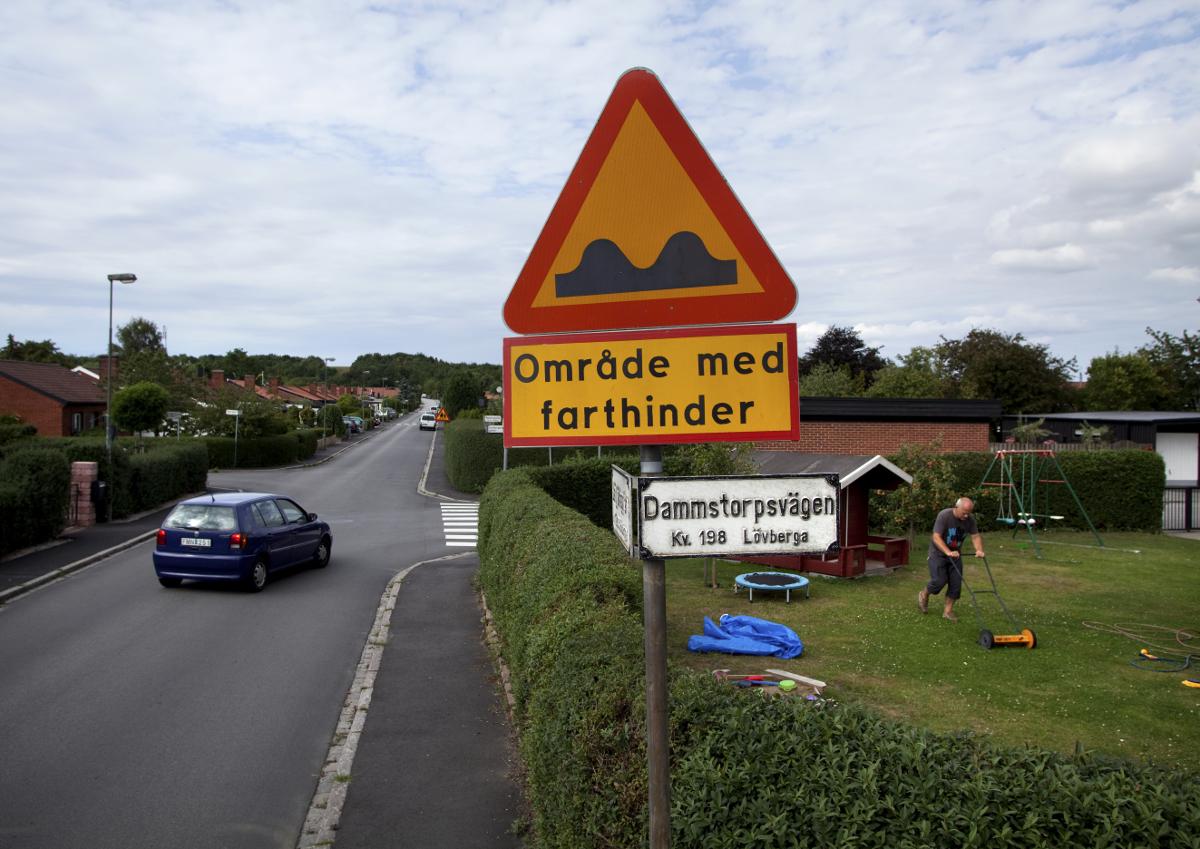 Husie, trafikskylt, bil, vägskylt, trädgård, man, gräsklippare, gata, villaområde
