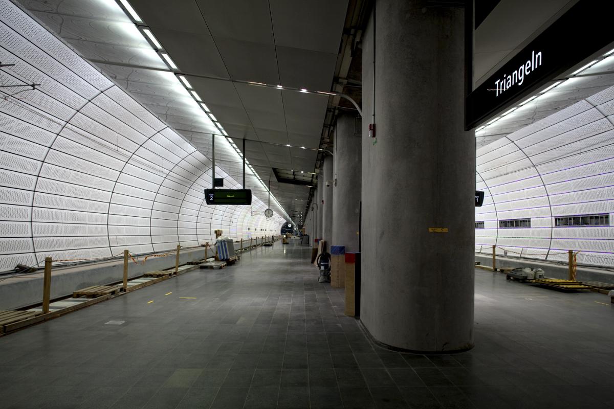 Station Triangeln och den södra uppgången mot Tandläkarhögskolan. Triangeln är tänkt att bli en viktig knutpunkt i Malmös trafiksystem. Stationen kommer att ha två uppgångar, i norr respektive söder. Konstnären Gunilla Klingberg svarar för utsmyckningen av båda uppgångarna. I den södra har hon skapat en stor sol av gulfärgade lysrör. I stationshallen har en annan konstnär, Christian Partos, låtit små varelser av ljus bosätta sig. De kikar fram när ett tåg ger sig av och gömmer sig i tunnlarna när ett tåg är på väg in. De hålls vid liv med lysdiodskenor. (Ur Dokument Malmö).