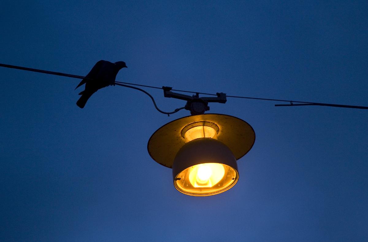 Tänd gatulampa och silhuett av fågel på elledning på Baltzarsgatan