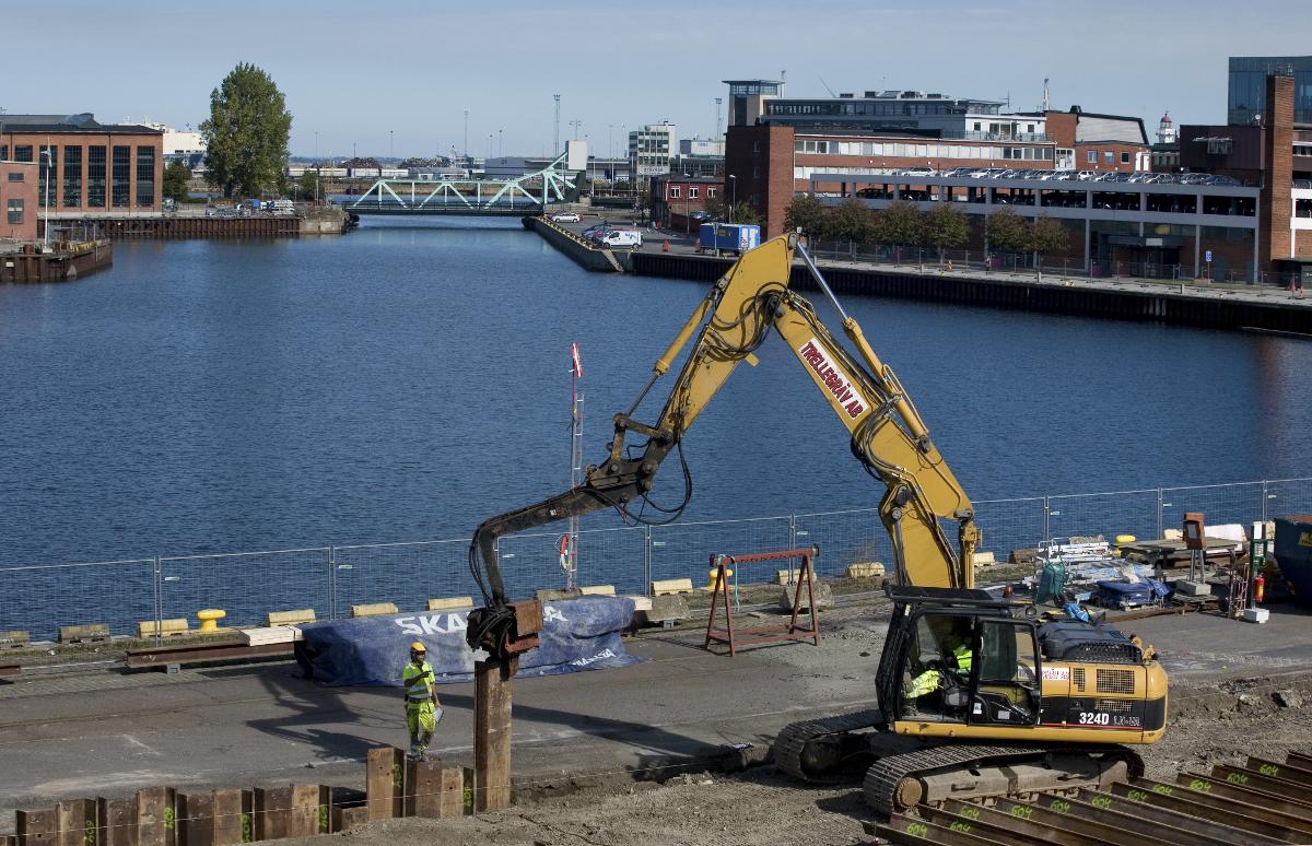 Bassängkajen under förstärkning inför nybygge.