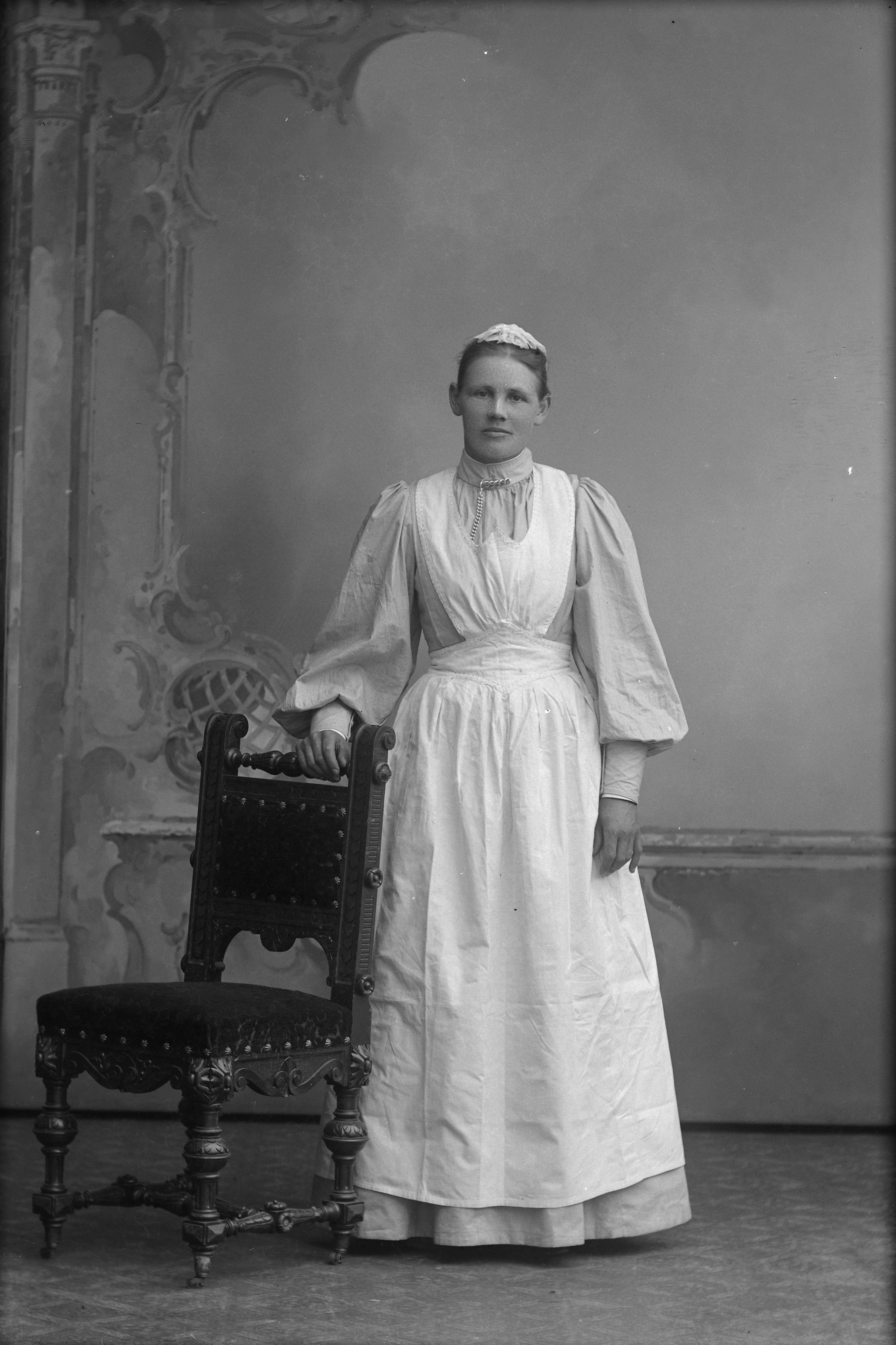 Porträtt i helfigur av Sofia Olsson, iklädd dräkt, möjligen folkdräkt, bärande liten hätta på huvudet. Stående vid stol, fotograferad framför ateljéfond.
