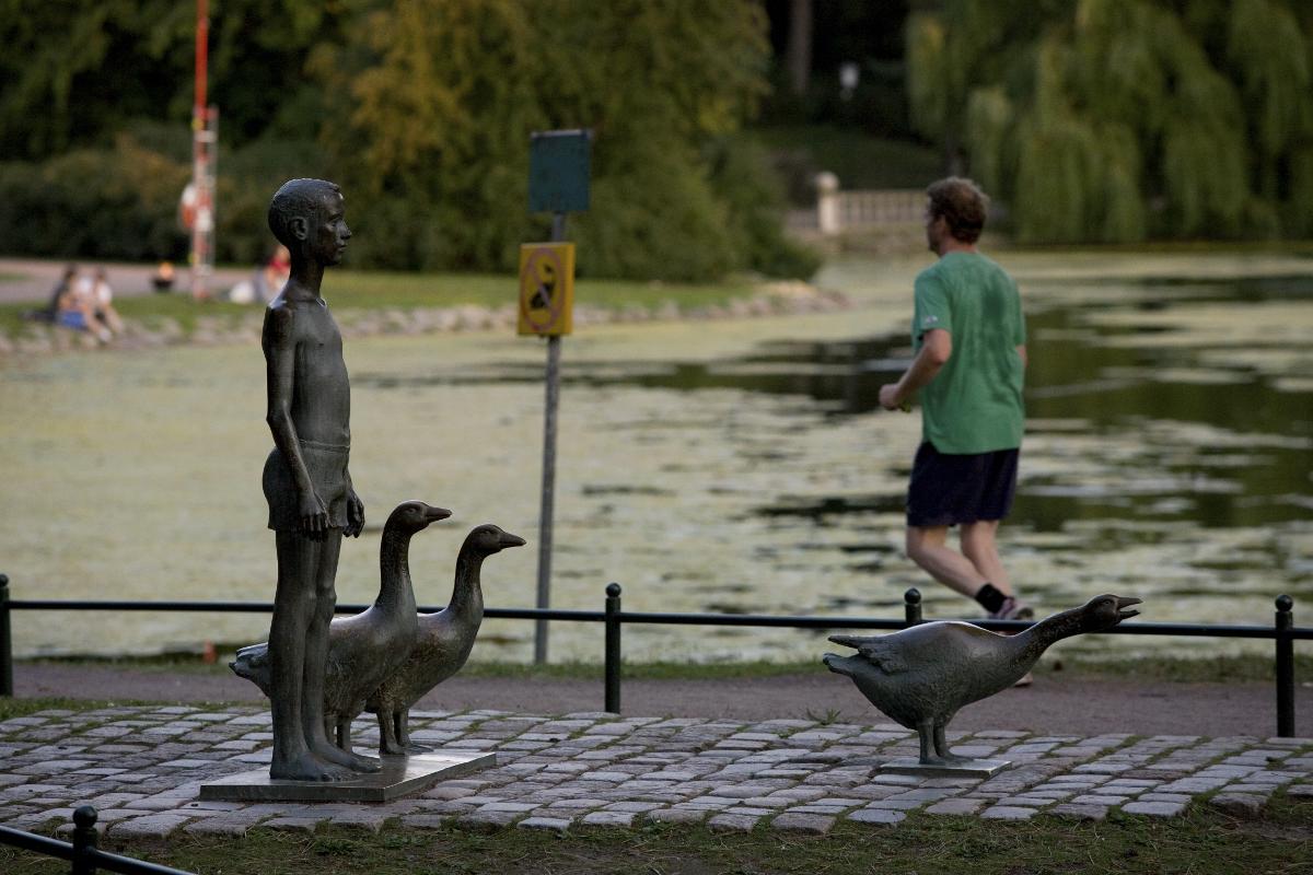 Statyn "Pojke med gäss" av knstnären Thomas Qvarsebo.