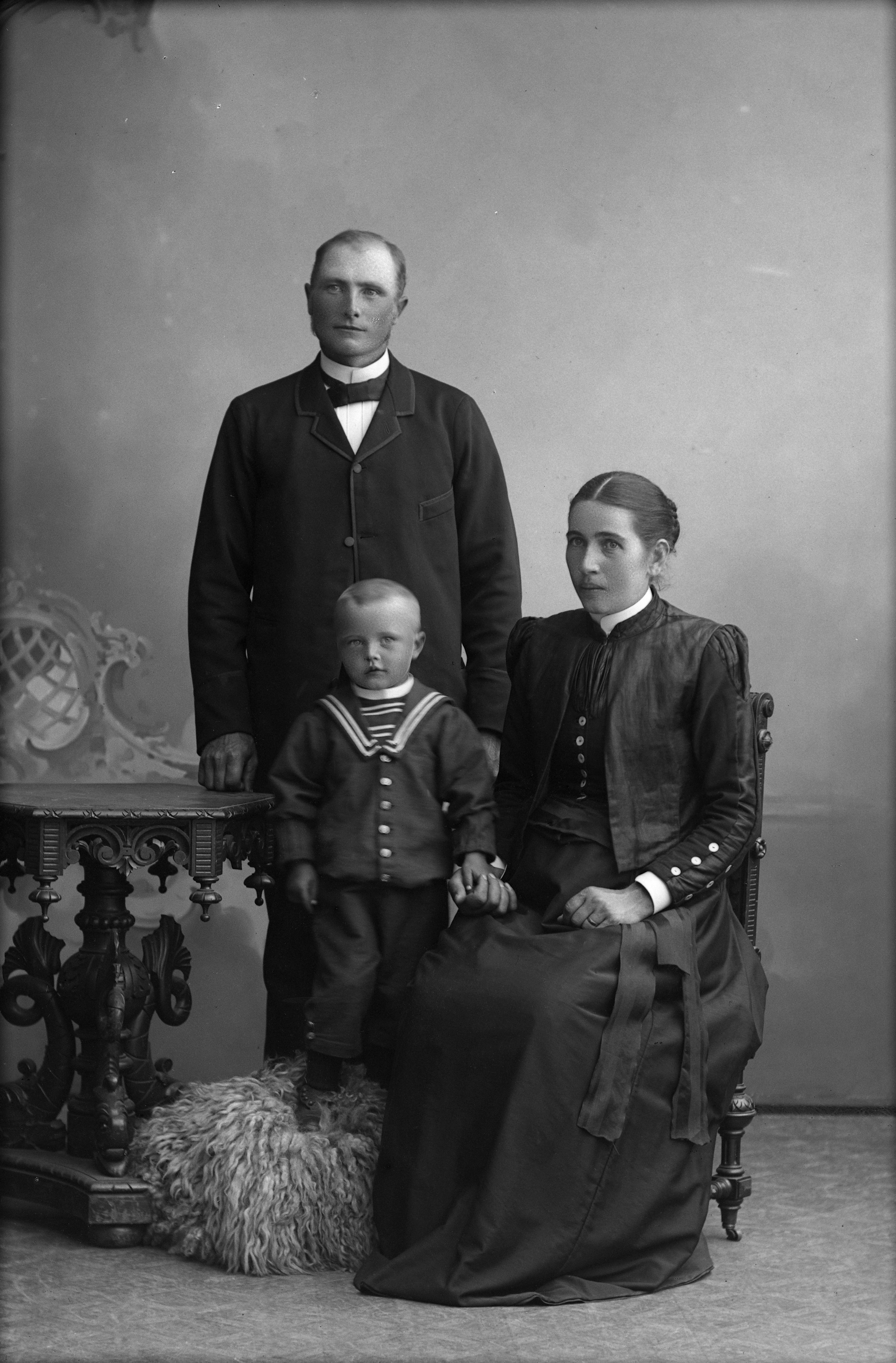 BS 020045 :: sjömanskostym, fluga, stol, bord, fäll, fondvägg
