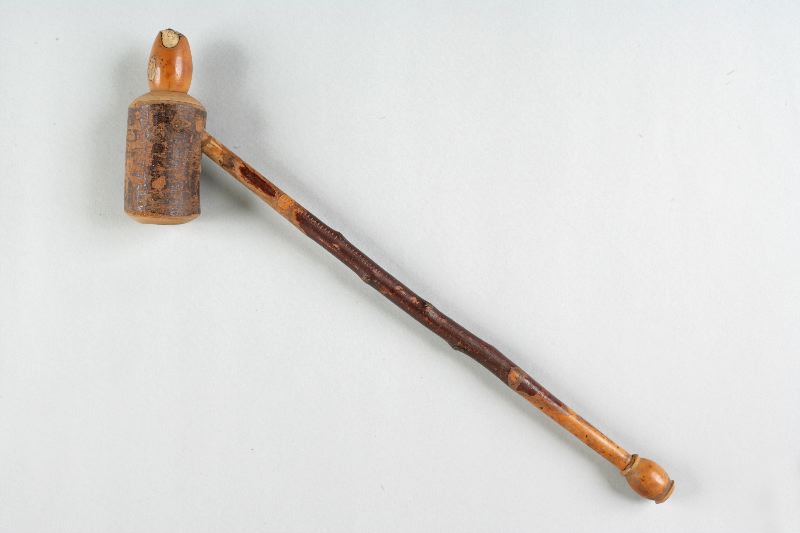 Tobakspipa av 2 sammanfogade körsbärsgrenar, delvis med barken kvar. Skaft av en naturvuxen gren med svarvat munstycke, piphuvud av ett grövre trästycke med en svarvad dekorationsknopp.