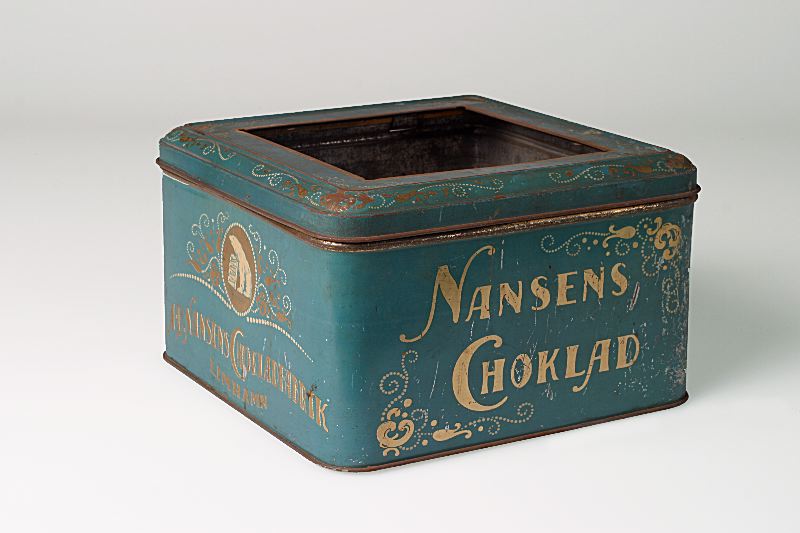 Chokladburk av plåt. Märke: NANSENS CHOKLAD LIMHAMN