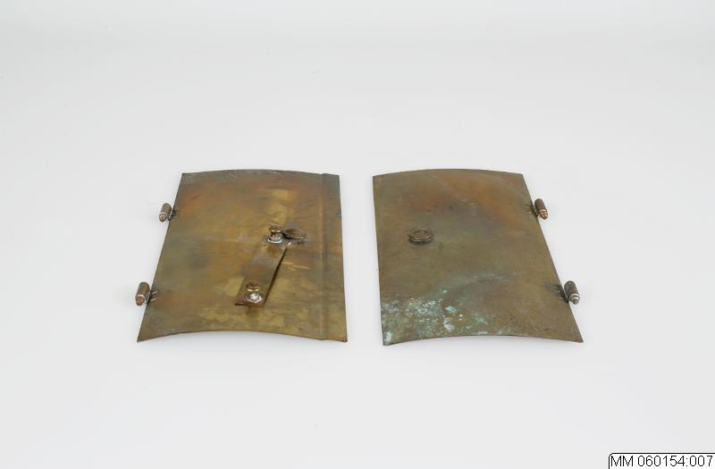 Kakelugnsluckor, 1 par, av mässingsplåt. Ena luckan märkt: Zetterlund / Eskilstuna.