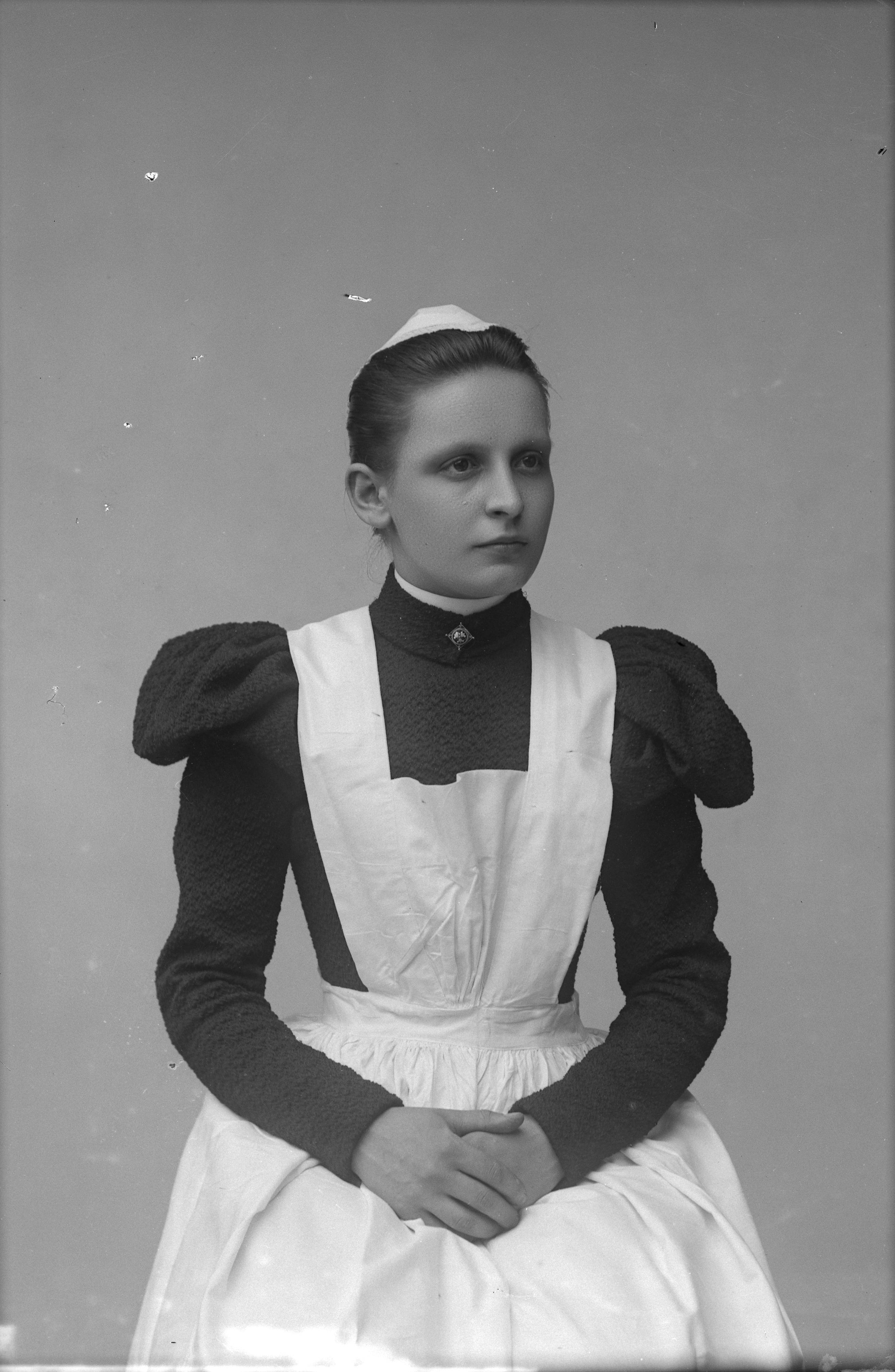 Porträtt i halvfigur av Hilma Larsson, iklädd sjuksköterskeuniform.