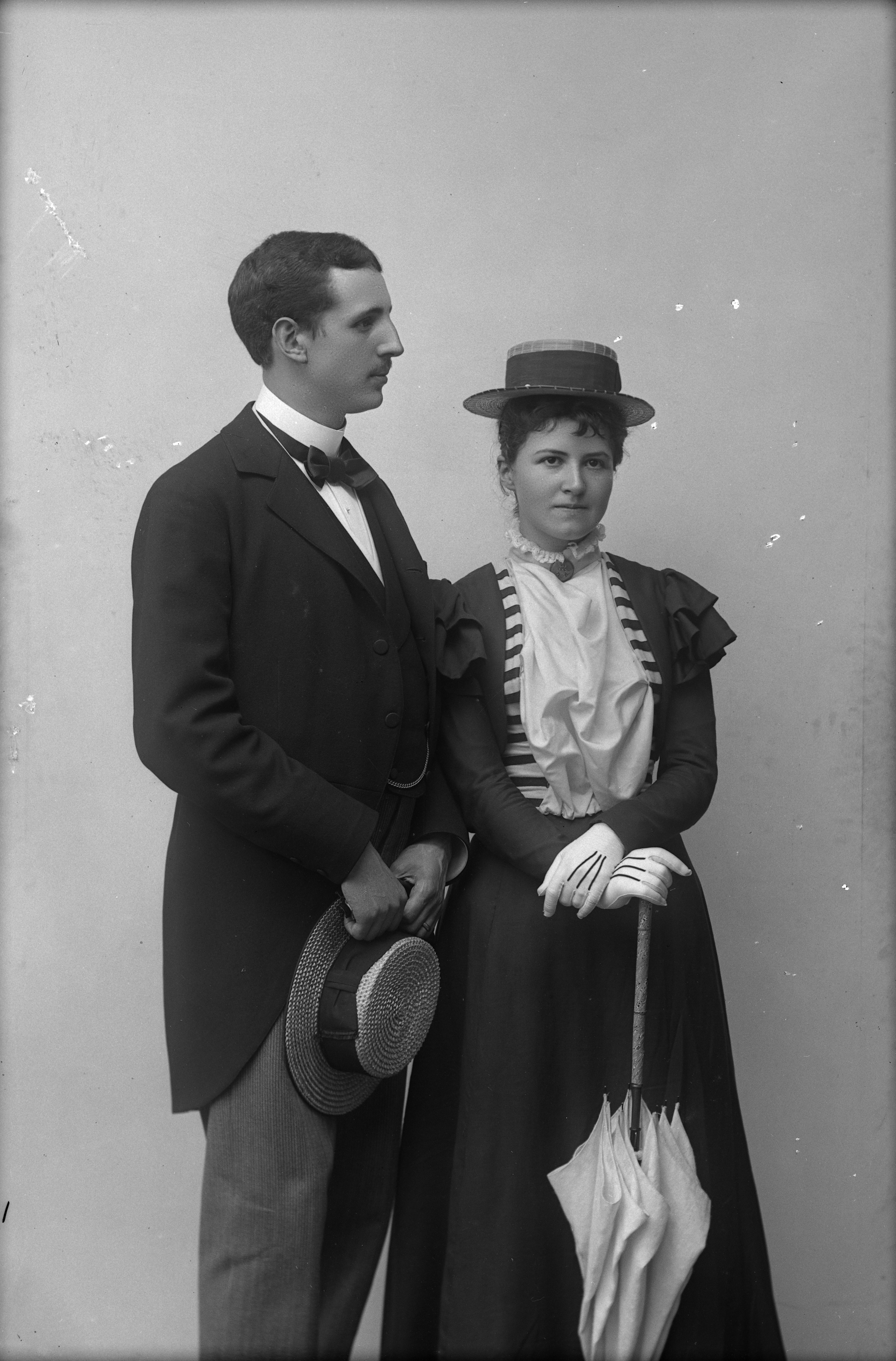 Porträtt i helfigur av lotslöjtnant Axel Drake med frun Eva. Frun iklädd hatt och handskar, hållande paraply, maken hållande hatt i handen.