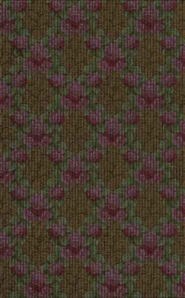 - Papperstapet med tryckt rosmönster. Mönstret är ganska suddigt, men rosorna är sammanhållna i regelbundet satta buketter. Murriga färger i beigebrunt, olika nyanser grönt och olika nyanser rosa. Över alltihopa är ett tunt svart mönster tryckt. Från fastighet på Norra Vallgatan i Malmö där givarens föräldrar och morföräldrar var bosatta.
