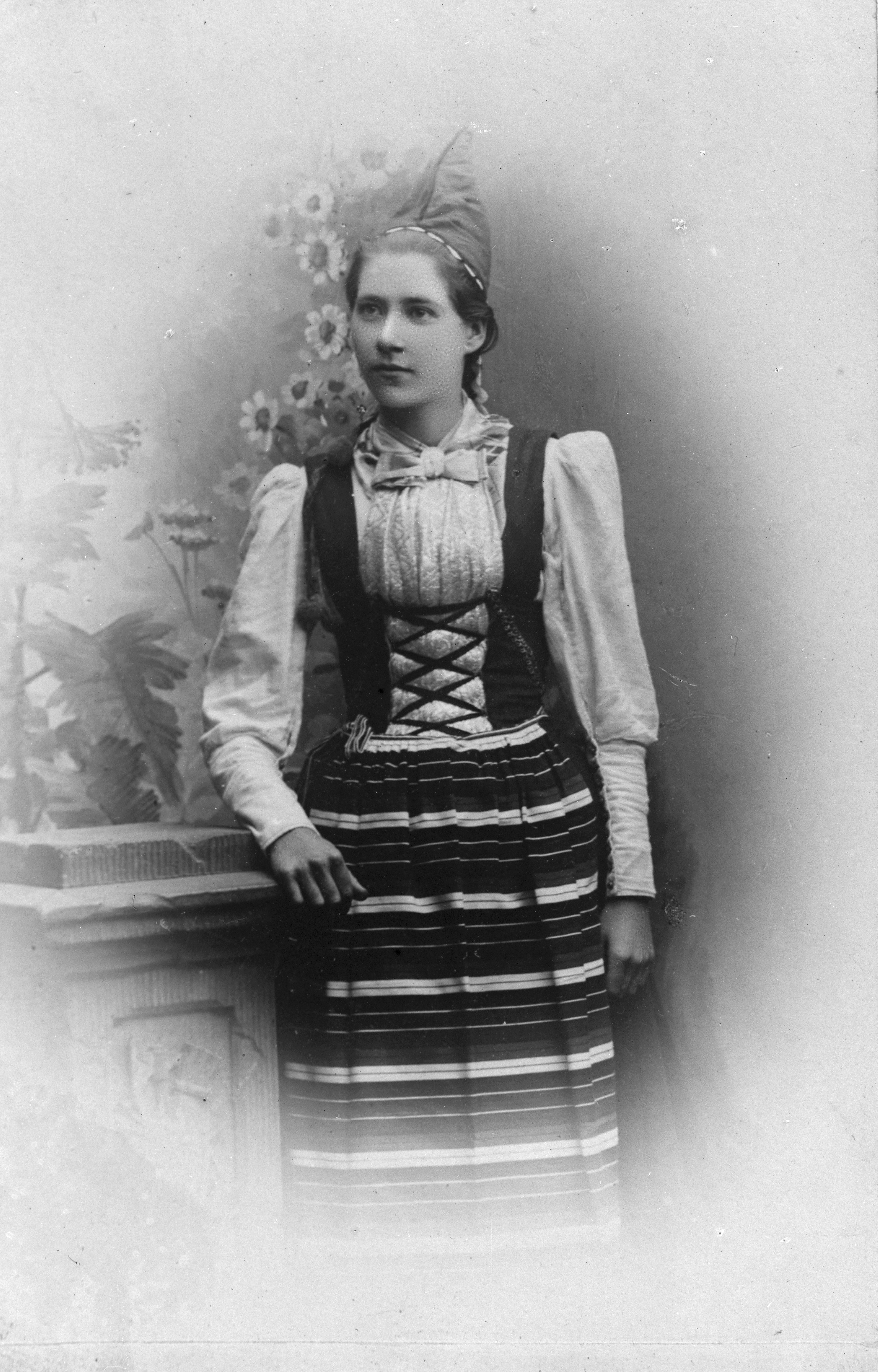 Porträtt i helfigur av Clara Andersson i folkdräkt.