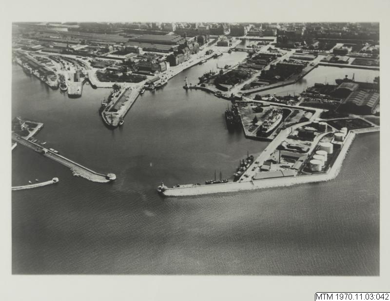 - Flygfoto över Malmö hamn sett mot sydost. Vi ser Stockholmskajen och Strandpaviljongen i vänster bildkant, Centralposthuset och Centralstationen i mitten av övre bildkant och Kockums varvsområde i höger bildhalva.