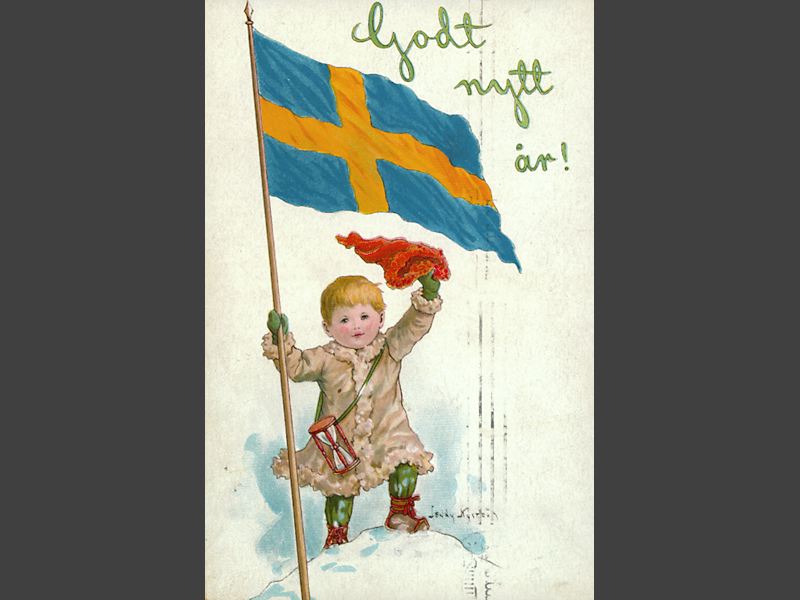 Nyårskort med motiv av en liten pojke hållande svenska flaggan på stång i höger hand och en röd mössa i vänster hand. Motivet är tecknat av Jenny Nyström. Text: "Godt Nytt År".
