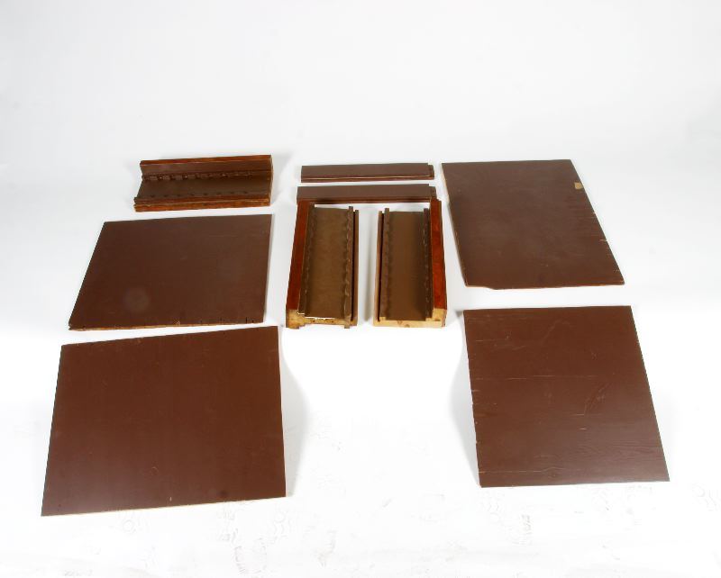 Svängdörrarna består, förutom fur och valnöt, av glas och kanterna är klädda med läder fastsatt med nitar av gul metall. Mått se teckningar på äldre katalog kort, blad II.