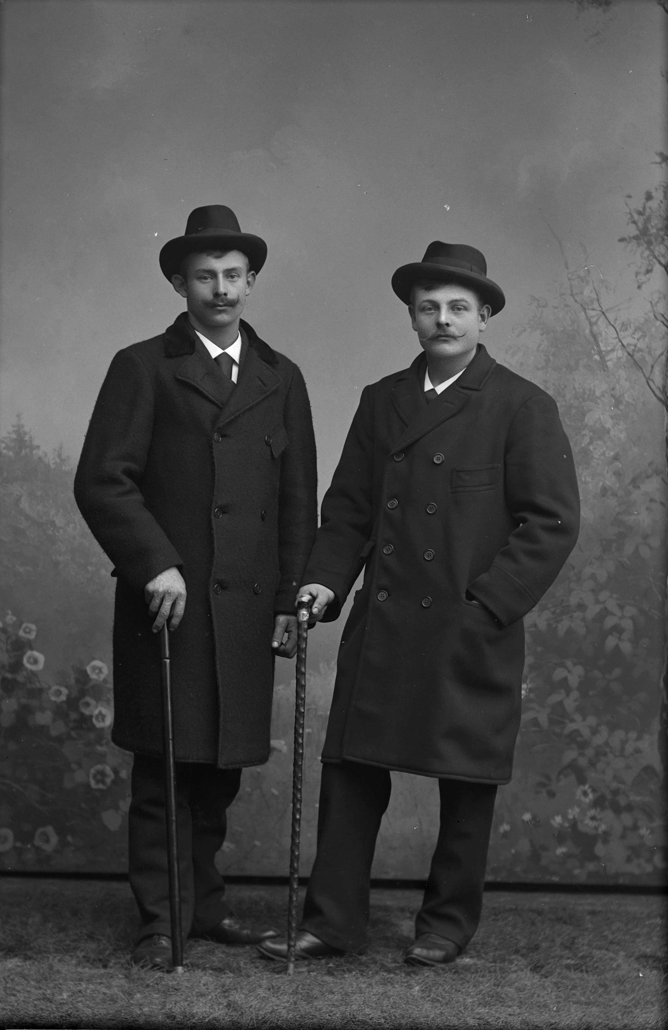 Porträtt i helfigur av G. Thern och A. Andersson, iklädda hatt och ytterrock, hållande käppar.