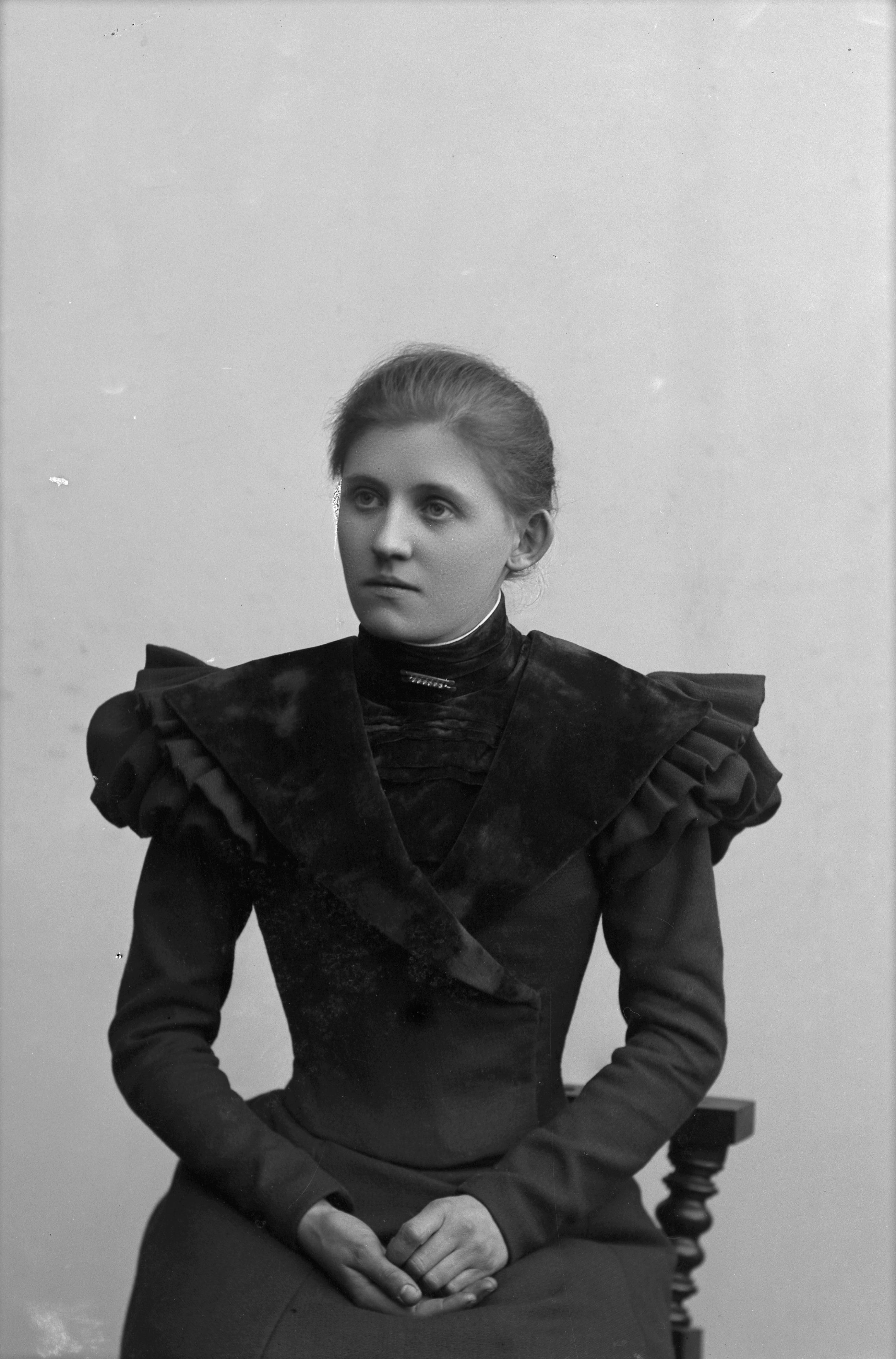 Porträtt i halvfigur av linnesömmerskan Hilma Kockum.