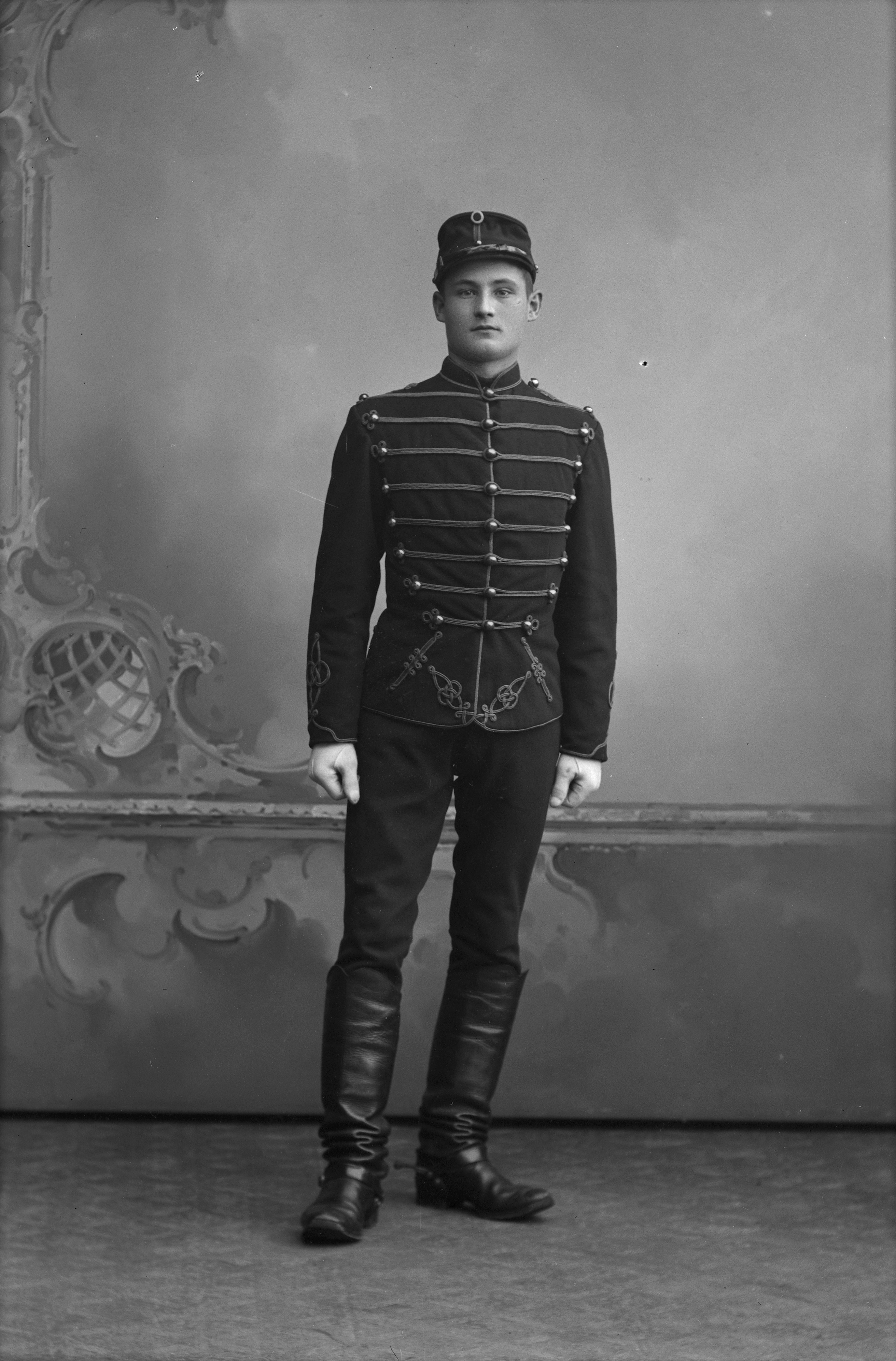 Porträtt i helfigur av Johan Ludvig Alfredsson Svedberg, iklädd militäruniform och -mössa.