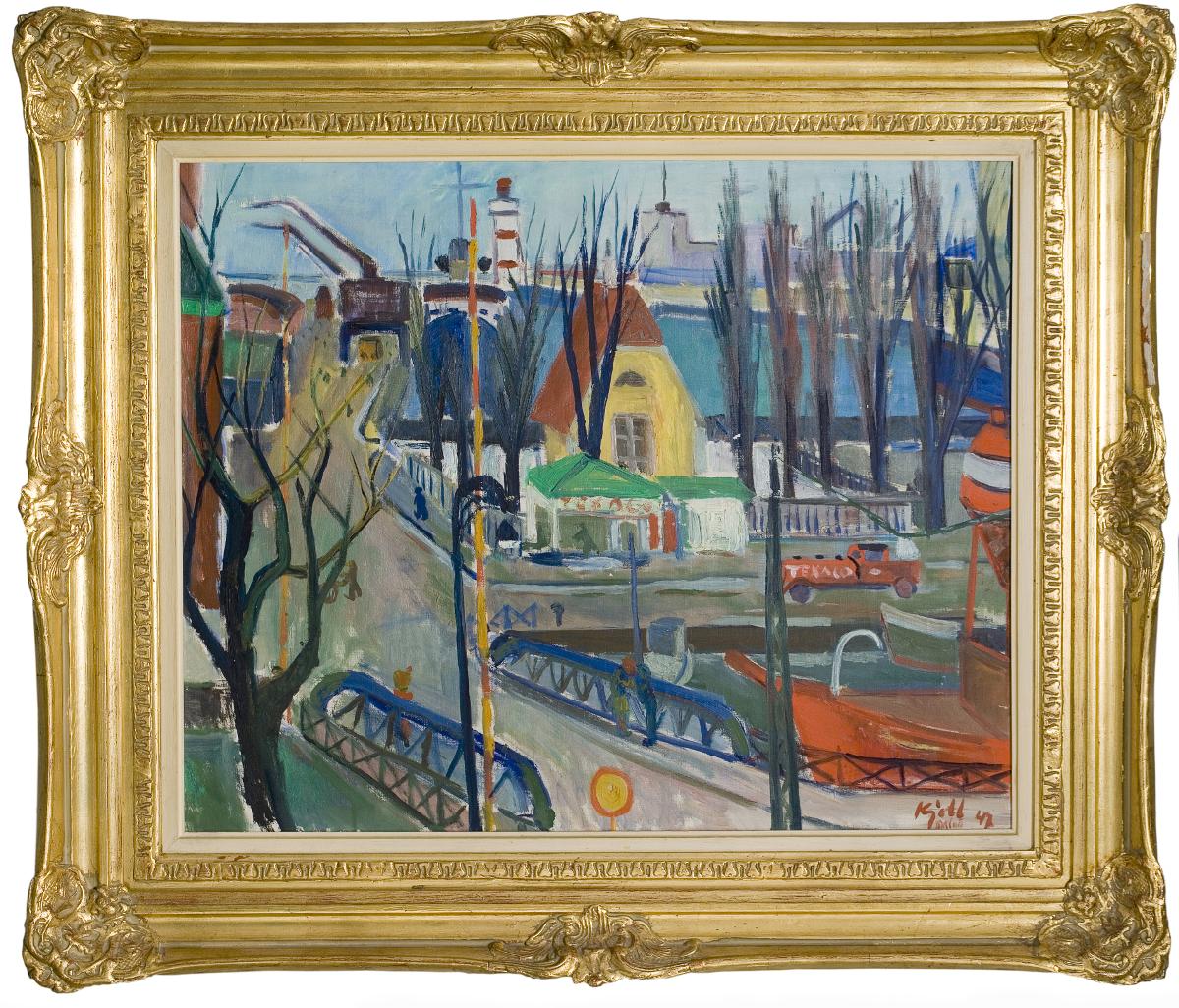 - Målningens motiv är sett från Norra Vallgatan norrut mot Inre Hamnen, förmodligen från ett fönster några trappor upp i intilliggande kvarter. I vänster bildkant skymtar man hamnförvaltningens röda tegelbyggnad, mitt i bilden syns hamnmästarboställets gula gavel och röda tegeltak och framför denna en Texaco bensinmack med grönt tak. Järnbron i bildens förgrund är Hjälmarbron och man kan följa Hjälmaregatans sträckning ut i hamnområdet förbi hamnkranar och båtar som ligger vid kaj. Man kan också se Inre Hamnens rödvita fyrtorn och silhuetten av Smörkontrollen längst ut på Skeppsbrokajen strax till höger om fyrtornet.