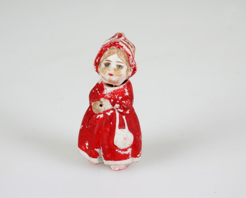 Docka, flicka, av porslin med rörligt huvud. Röd kappa och hatt, brunt hår. Märkt "Germany".