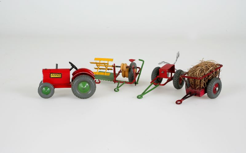 - Leksakstraktor av rödlackerad plåt med gummidäck. 3 olika löstagbara släp; höskrinda, hövändare och harv.