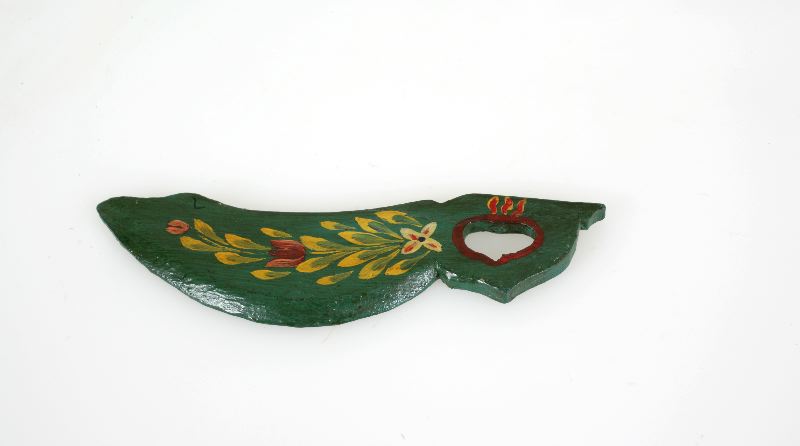 Skäkteträ av fur, grönmålat med dekormålning av blommor och blad i rött och gulgrönt.