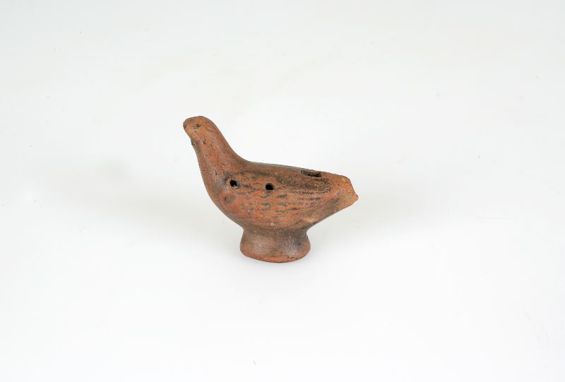 Lergök av brun keramik, näbben och stjärten är avslagna.