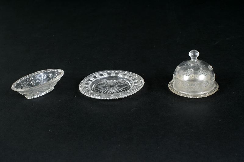 Dockservis av pressglas. Ostkupa, 2 tallrikar och 3 uppläggningsfat.