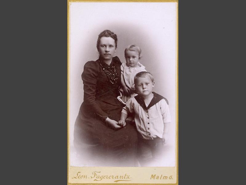 Visitkortsfotografi. Porträtt av Augusta Hörstedt, född Adrian, med två av sina åtta barn.
