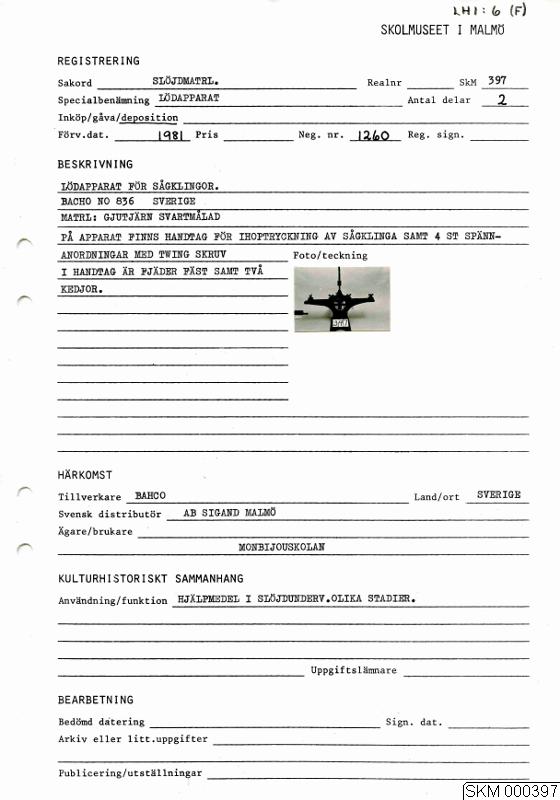 - Lödapparat för sågklingor. Bahco no 836 Sverige. Gjord av svartmålat gjutjärn. På apparaten finns handtag för ihoptryckning av sågklinga samt fyra stycken spännanordningar med twing-skruv. I handtag är fjäder fäst samt två kedjor.